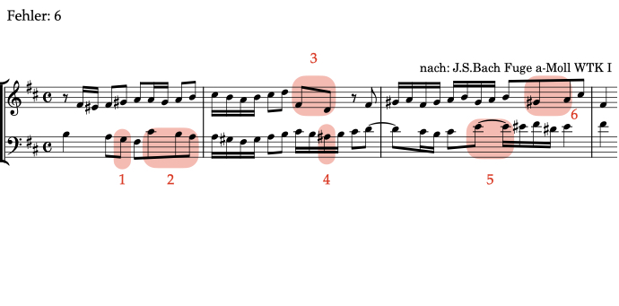 Alle Beispiele im Bereich Fehlerhören sind transponierte Varianten von Übungen, die an anderer Stelle in ear-training.org vorkommen. Aus diesem Grund steht das folgende Beispiel in einer anderen Tonart als im Original.