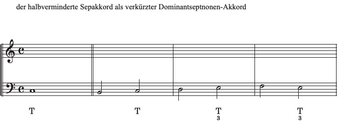 Allerdings kann der halbverminderte Septakkord in anderem Zusammenhang auch subdominantisch interpretiert werden (z.B. als moll-Subominante mit Sixte ajoutée (s. Kurs B 2.). Der halbverminderte Klang ist somit ein äußerst geheimnisvoller, ambivalenter und wandelbarer Klang - in der Romantik wird dieser Akkord zentral (z.B. "Tristan-Akkord"). Wir werden den halbverminderten Akkord als Subdominante in den nächsten beiden Kapiteln genauer untersuchen (Kurs C 3., Kurs D 1.).