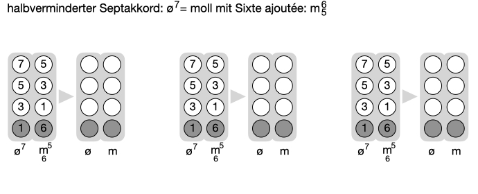 Der halbverminderte Sepakkord (ø7) ist für das höranalytische Verständnis schwierig: Die oberen drei Akkordtöne 3-5-7 ergeben einen Molldreiklang, und die Quinte über dem Grundton (1-5) ist nicht rein. Aus diesen beiden Gründen haben wir beim ø7 kein gutes Grundtongefühl und hören eher einen Molldreiklang mit Sixte ajoutée (m65), z.B.: